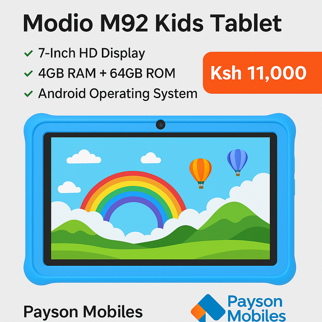 Give your child a head start in learning with the Modio M92 Kids Tablet — available now for KSh 11,000 at Payson Mobiles Nanyuki.